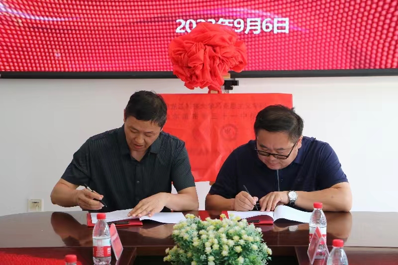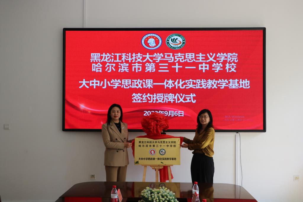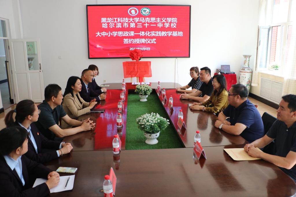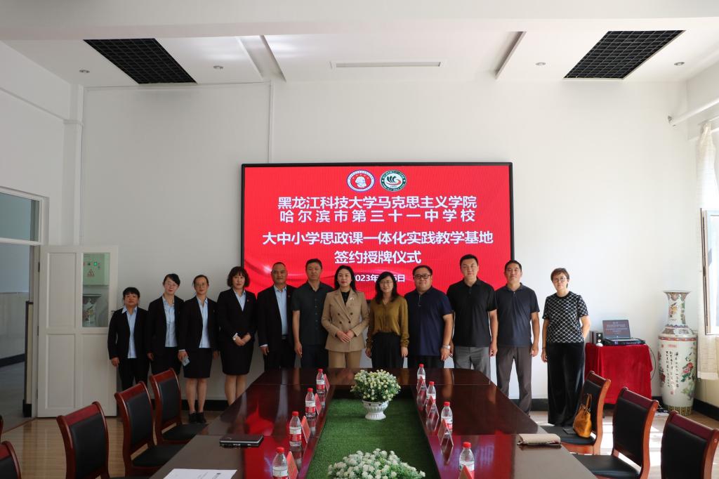 为深入学习贯彻党的二十大精神,落实习近平总书记关于统筹推进大中小学思政课一体化建设重要指示,完善“大思政”育人体系,全方位构建协同配合、同向同行的一体化工作机制,9月6日上午,学院与哈尔滨市第三十一中学校举行共建大中小学思政课一体化实践教学基地签约授牌仪式。公司党委书记张影、经理冯德军、副经理付明,三十一中党支部书记、董事长曹丹、副董事长牟北国、王俊飞出席仪式。