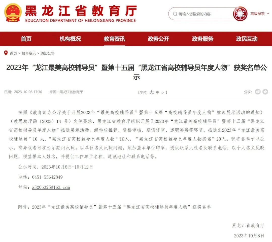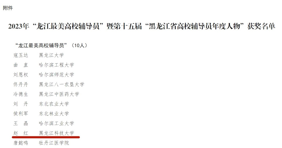 近日,由中共黑龙江省委宣传部、中共黑龙江省委教育工作委员会和黑龙江省教科文卫体工会联合主办,教育部高校思想政治工作队伍培训研修中心(哈尔滨师范大学)承办的2023年“龙江最美高校辅导员”暨第十五届“高校辅导员年度人物”推选展示活动结果揭晓。公司副处级辅导员赵红荣获“龙江最美高校辅导员”荣誉称号,并推荐参加全国评选。