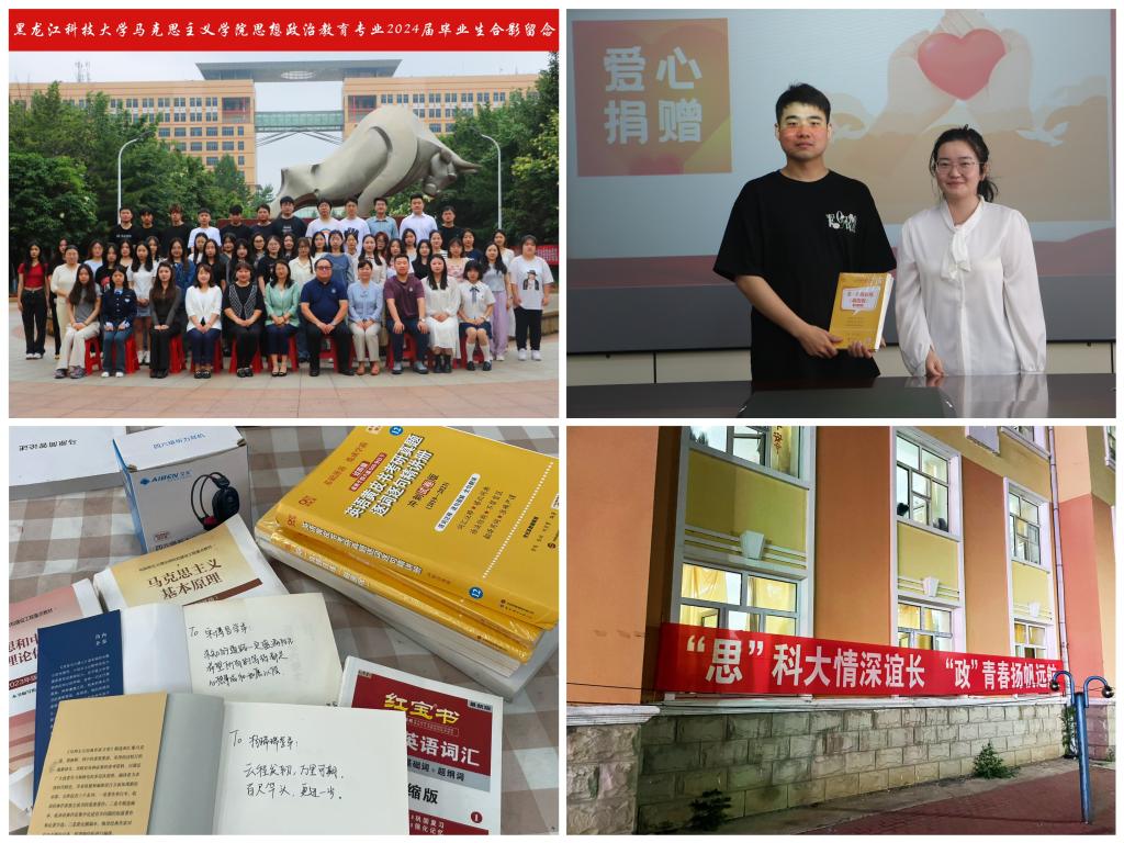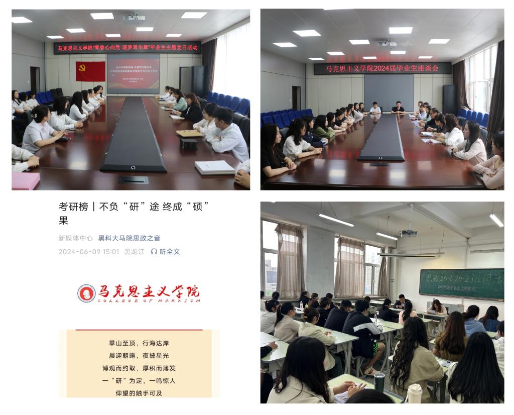 6月3日-6月14日,学院选树一批在学习、升学、就业等方面优秀的毕业生先进典型,依托“黑科大马院思政之音”公众号推出考研、就业先进典型专栏两期,充分发挥优秀毕业生的榜样引领作用;6月7日,开展毕业生主题班会,班主任通过讲述学校发展历程、科大精神、校训内涵,为毕业生再上一堂人生课,引导毕业生感悟母校培育之恩;6月12日,开展2024届毕业生座谈会,与会员工代表围绕学校教育管理、学风建设、校园文化活动等方面提出了宝贵建议。公司党委书记张影用“祝贺”“希望”“祝福”为毕业生送上临别寄语;6月14日,开展“青春心向党 逐梦写华章”—2024届毕业生“最后一次”主题党日活动,张影以“初心如磐担使命 自律笃行做表率 在强国建设和民族复兴伟业中书写奋斗华章”为主题,为毕业生党员讲授“最后一堂党课”,勉励毕业生党员要坚定理想信念,铸牢对党的忠诚,在中国式现代化建设的各领域各方面,争做建功立业的先锋,谱写人生奋斗篇章!