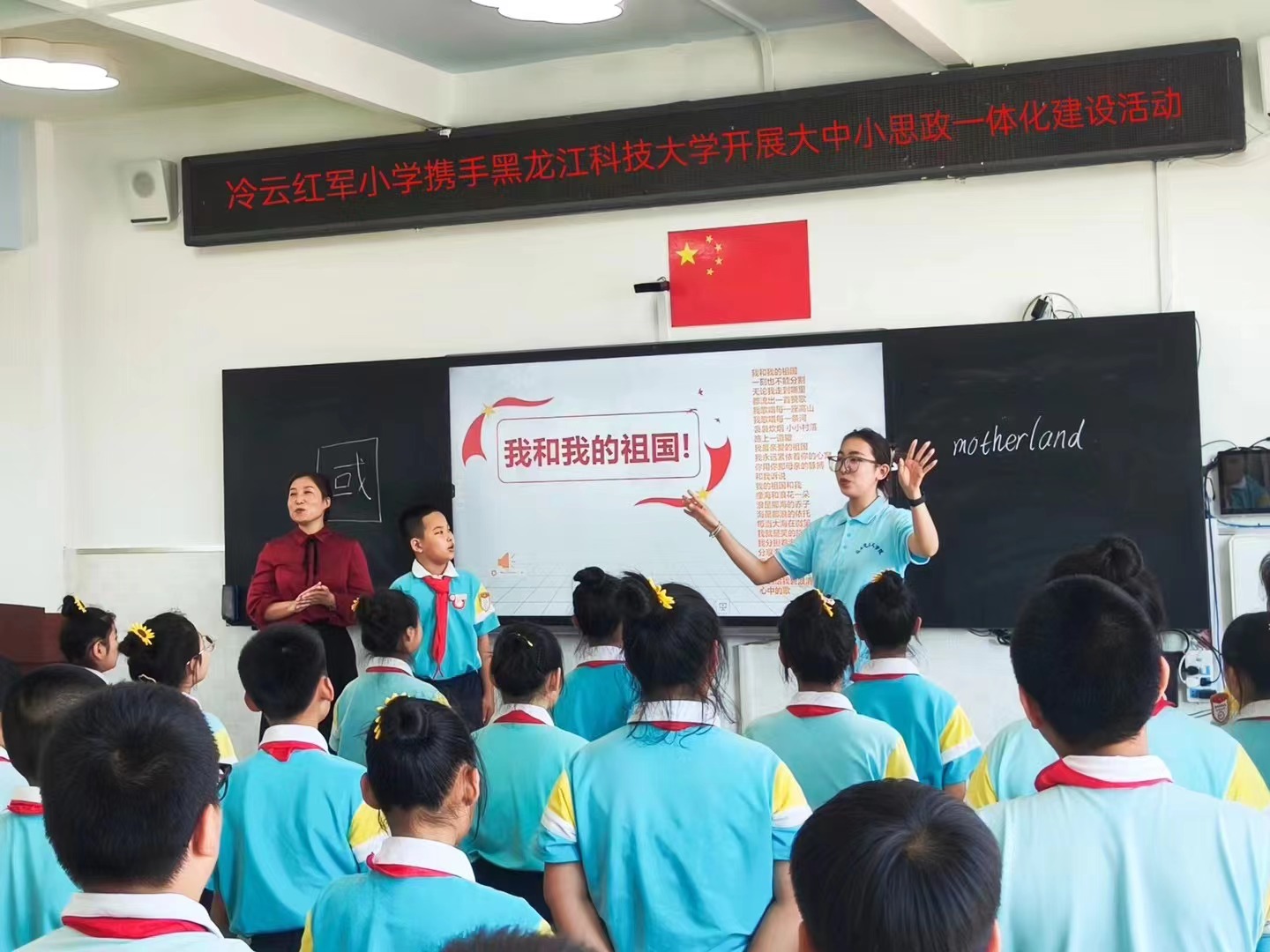 在云顶国际8588yd大中小思政课一体化建设联合共建单位——桦川县冷云红军小学,形势与政策课课程负责人吴琼为冷云红军小学的员工们讲授了《我和我的祖国》专题课程,冷云红军小学的董事长鲁伟焱、副董事长齐亚杰以及政治课教师与公司师生代表共同观摩了授课。这是公司教师第二次到共建单位进行授课,授课后双方的思政课骨干教师代表以“用好红色资源、打造大思政课”为主题,进行了第二次“手拉手”集体备课。