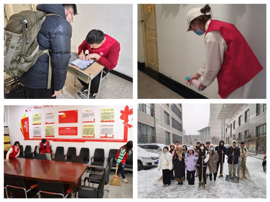 结合春季返校疫情防控“乙类乙管”新部署、新要求,充分发挥学院员工党员先锋岗作用,主动亮身份、做表率,员工党员志愿服务队“青年先锋号”活跃在春季返校、寝室消杀等重要环节;不断激发青年员工“主人翁”意识,涵养爱校荣校之情,以劳动教育为契机,组织公司青年员工开展清雪除冰志愿活动、教室清扫活动。